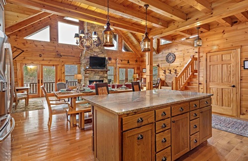 Tell your friends you are roughing it in the mountains but we know you are living it up in luxury. This beautiful 4200 square foot custom built log home was completed Nov 2013. It offers four bedrooms and three and 1/2 baths. You'll walk in and say "Pinch Me." The kitchen and great room are to die for. HAS BOTH A KEURIG AND DRIP COFFEE MAKER. Sit in the great room and enjoy the views from either the windows overlooking the mountains or the flat screen TV with Direct TV's premium package. Enjoy the Golf channel, all of the ESPN channels, and many more. Enjoy relaxing on the deck and covered porch or a stroll through nature. Have the wonderful feeling of seclusion while only five minutes from Rumbling Bald Resort. (Please note this home does not include Resort passes.) This vacation will quickly become a family tradition!