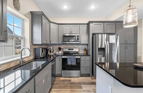 Inside, the home is designed for comfort and connection. The living room welcomes you with a plush couch, two armchairs, and a smart TV perfect for movie nights. The sleek kitchen boasts stainless steel appliances, dark countertops, a drip and Keurig coffee maker, and counter seating for four. Gather around the dining table for seven to share meals and stories after a day of exploring. Outdoors, a private patio with a bubbling hot tub and cozy seating invites you to unwind under the stars, making this the perfect retreat for your Branson getaway.