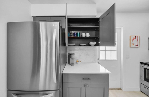 The kitchen is stocked with supplies to cook, but if you find it's missing something, reach out and we'll do our best to supply you with what you need! One important thing to note is that there is no dishwasher. However, there is a sponge, dish soap, and dish rack, to wash your dishes.