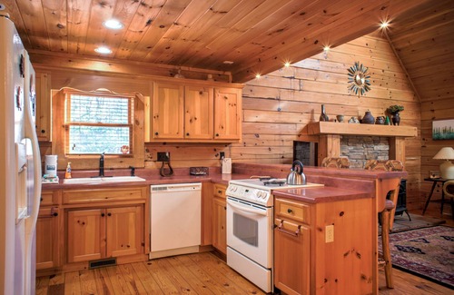 Let Pisgah Pines capture your heart with the authentic feel of Appalachian living. Just ten minutes from the Asheville, NC airport, this classic log cabin is comfortably furnished with lodge decor, including rustic log bed frames and wooden rockers on the covered front porch - perfect for relaxing outdoors in any weather. The large living area offers a cozy space for gathering together with friends and family, and a free-standing gas fireplace gives you the ambiance of a wood stove without the hassles of burning wood. Prepare your favorite homestyle dinners in the fully equipped kitchen, and you can choose to dine indoors or out on the deck for each meal. Sleeping options include a master suite sanctuary on the upper level, with a convenient second living area and a full bathroom. The main level bedroom suite includes a king-size bed and separate access to the side deck. If your group needs additional sleeping space, a bunk bed in the loft area is great for the kiddos. Outdoor relaxation comes easy here, especially when you're soaking in the hot tub. The roof over the hot tub makes it easy to use year-round! The deck is great for taking in the sounds of nature and the wooded views. Pisgah Pines can be your new happy place - there's plenty of room around the fire pit for roasting marshmallows! This Asheville vacation rental is located in Arden and is approximately 25 minutes from downtown Asheville.