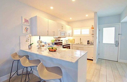 Relax in the open-plan living room, complete with plush furniture, a large-screen TV, and high-speed Wi-Fi. Step out onto the screened lanai, furnished for outdoor dining and perfect for enjoying ocean breezes and Cayman sunsets. The modern kitchen is fully stocked with everything you need to cook at home, including a refrigerator with ice maker, stove, oven, microwave, blender, Nespresso coffee machine, and dinnerware for six. Six folding beach chairs are also provided for your beach days.