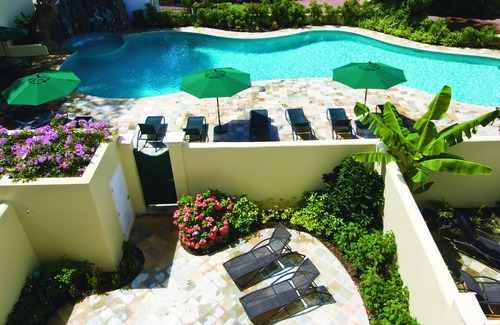A gate leads directly from the garden to an extensive freeform pool with waterfall feature, the largest of two pools that Mullins View shares exclusively with 7 other townhouses.