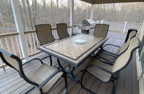 Bring your family & friends to this great place, with lots of room for fun, located at Big Bass Lake Community in the Pocono Mountains! Conveniently located from NY/NJ/CT. This modern Mountain Chalet has a lot to offer-hot tub hidden in woods/spacious patio/covered deck/outdoor fire pit /fireplace, BBQ grill, Tesla electric charger and numerous community amenities. Access to all 3 Lakes, indoor and outdoor pool, teen center, tennis and basketball courts, close to popular ski resorts & much more!