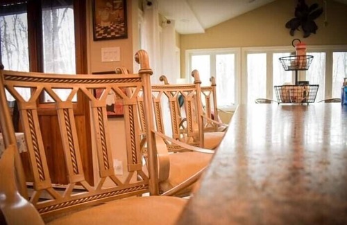 All the windows. Wake up in nature our home sits back in the woods with wild life all around. See Turkeys, deer, bear, fox and much more. Our chalet offers a beautiful deck over looking the nature and a beautifully planned patio with grill. And fire pit, Lots of seating to enjoy the outdoors and nature. Indoors is decorated to perfection like a log cabin all walls are knotty pine with that mountain home feel. You will enjoy a quiet evening by the wood burning fire place enjoying the oversized Lazy Boy full size sofas and cathedral ceiling in the main living room. The kids can hang out in the scenic sun room which is a second living room. With gorgeous views from all the windows and sliding doors to back deck. Our kitchen has a huge island that attracts all the family to a centrally located area of the house to make for a wonderful gathering spot. All this and a short walk to all resort activities to biking hiking swimming.