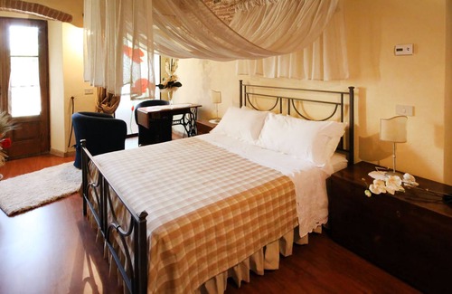 Bedroom 1: This ground-floor bedroom is a feast for the eyes, with half-plastered walls revealing the original brick and stonework. There is a canopied double bed, a small table, which doubles as a workspace, a wardrobe and en suite bathroom. Double doors lead out onto a private terrace.