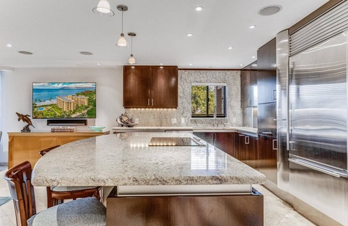 Polo Beach Club 408 is a stunningly renovated vacation rental that offers breathtaking ocean views, making it an ideal getaway. Guests can relax on the lanai, enjoying the sight and sound of turquoise waters gently lapping the shores of the serene Polo Beach, conveniently located near the Wailea Beach Walk.
