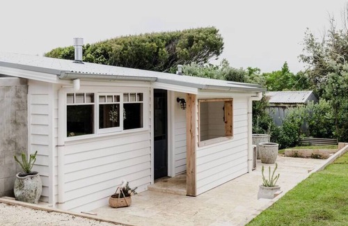 In the backyard you will find an outdoor shower for quick rinses after the beach, a lawn perfect for a game of quoits and a beautiful oak dining table under a covered pergola. There's a heater over the top for when it gets a bit chilly in the evening. The verandah at the front of the cottage is one of our favourite places to sit to watch the sun go down and the world go by.