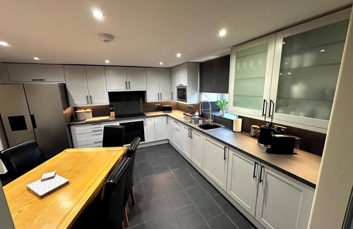 The entrance (with access to a downstairs WC) leads into the dining room with a large table - perfect for dining and board games - leading into a fully equipped kitchen that includes an induction hob, microwave, full-sized fridge freezer, dishwasher, Nespresso machine, washer dryer and additional dining table and chairs.