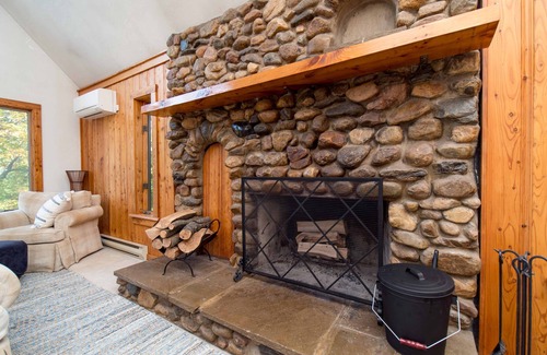 As you go up the stairs, you’ll come to a large living room with huge windows overlooking the pond, a wood-burning fireplace, TV and a wet bar. On this level, we have a mini-split A/C system that cools the great room and main bedroom and another mini-split system cooling the dining/kitchen/loft area. In the living room cabinets, we have games, puzzles and toys for kids.