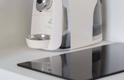 Induction hob, oven, dishwasher, coffee machine (capsule), fridge with freezer, electric kettle, tableware and kitchenware, wine glasses