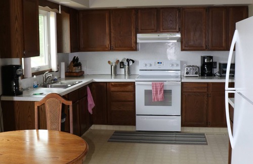 Prairie Pines Lodge is a very private, 15 acre farmstead with a remodeled, single story, ranch-style home with freshly finished basement. Complete kitchen fully equipped with all amenities. 7 full size and 2 queen size beds, 2 full baths with walk-in showers, laundry room, living room w/ 50" TV, large "gathering area" in the remodeled garage with smart TV, separate AC and heating controls for year round comfort. Hang out on the deck or by the fire pit. Large parking area with power available for boats or SnoBears. Waterfowl hunting opportunities on private land surrounding the lodge. Please contact us for more information and availability.