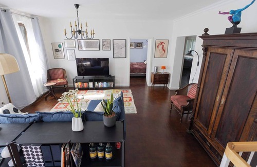 Premium huge 2-level apartment with a Rhine view, located in a stylishly restored historic building: a mix of original charm and modern comforts. Fully renovated in June 2025. Spacious living area, fully equipped kitchen with large fridge, dishwasher and washer-dryer. Game area with mini football table. Living room with Netflix and Sony PS. Wi-Fi, free street parking. Riverside and bike trails nearby. Only 30 min to Messe Düsseldorf and the airport. Great choice for comfort-focused travelers.