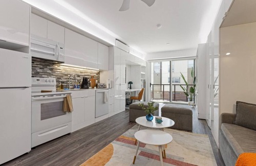 ✓ Open-concept, modern studio with chic furnishings