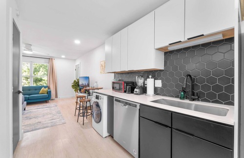 Our 400 sqft boutique studio apartment is pet-friendly (pet fees apply) and comes standard with a fully-stocked kitchen, 2-in-1 washer and dryer combo, flex table, full-sized bathroom, comfy queen bed, & ultra-fast internet to accommodate you in the modern times.