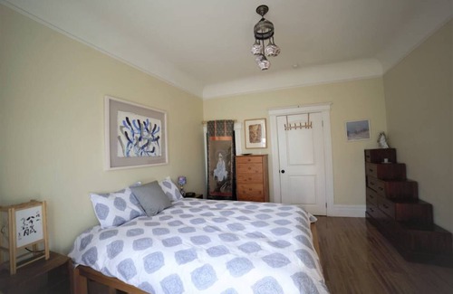 This San Francisco apartment boasts 2 inviting bedrooms. The soothing ambiance of the space will make guests feel right at home. The main, sunny bedroom features a queen bed with a high-end memory mattress and luxury sheets. The second bedroom has a full bed, ensuring a comfortable, quiet night's sleep. The lovely bathroom has a bathtub, shower, and hair dryer for convenience. In addition, guests can enjoy the spacious open-plan living/dining room with a dining table, couch, TV, and (if needed) an air mattress providing extra space for extra guests. The fully stocked kitchen has stainless steel appliances, and all necessary pots and pans to cook up a storm. With amenities like heating, a washing machine, WiFi, and an iron, everything you need is at your fingertips. It's easy to see why you can unwind at our place. It is perfect for business or vacation travelers and families.