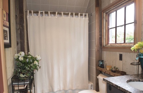 The "Poker House" is privately nestled in the woods and uniquely built with reclaimed materials and cowboy decor. (And, yes, there is a full felt-covered poker table) Full kitchen with cooking and serving equipment, downstairs bedroom has 2 double beds and a full bath, upstairs bedroom (king bed) with adjoining loft room (2 double beds) has a second full bath. Living area with lofted ceiling and room for a cot. Washer/Dryer on the lower level. Outdoor porches with tables/chairs in front; back patio extends into the woods. Outdoor charcoal grill, gas grill available. Firepit in a clearing in the woods next to the house stocked with firewood. Roku TV in living room (set to "guest" mode so guests can use their own preferred entertainment providers such as Netflix).