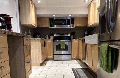 The basement apartment is completely private and includes separate driveway parking and EV charger. Outdoor patio comes equipped with gas grill.