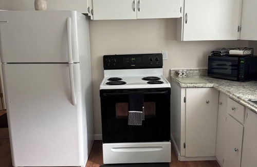 Forget your worries in this private and serene space. This lower one bedroom apartment has an enclosed porch when you arrive with your vehicle parked right outside the door. The living room has Futon/ double bed and a desk and chair for a comfortable workspace. Large country kitchen that is stocked with everything you need to cook meals. Snacks are included. There’s also a wall fireplace. The bedroom has a queen size bed, dresser and closet. Bathroom has a tub with a shower.