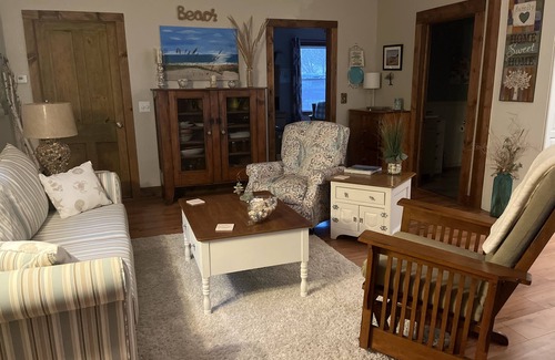 Two bedrooms both including queen size beds and a 50 inch smart TV in the master. Plus 1 queen and 1 full sized pullout sofa. Two full baths including a jacuzzi tub in the master bedroom. Two living rooms, one including a 65 inch smart TV. Full kitchen. Laundry with both washer & dryer. Three season screened room. Gas grill, outdoor fire pit with wood on site.