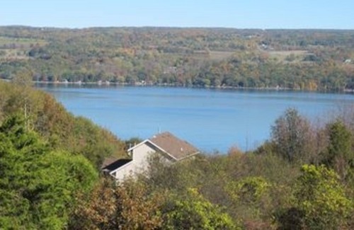 This lovely, Exclusive vacation home -nestled in a private 4 acre wooded compound, once an abundant fruit orchard on the breathtaking western shore of Seneca Lake, in the heart of the Finger Lakes Wine Country. Gorgeous, contemporary 3 bedroom (two are in an open loft, that is enclosed with glass to offer safety for children, that overlooks the rest of the house). This lake home provides