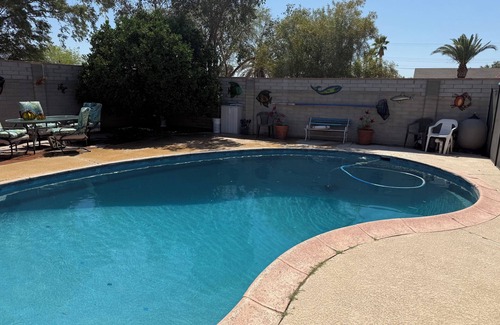This is a separate room from my house connect by the roof and a hallway between structures. A sliding glass door in your room leads to the backyard with a pool. We have a dog that is friendly that will great you in the backyard but does not have access to your space unless you invite them in. We cannot hear you and you cannot hear us with the doors closed as the brick structure is solid. You are welcome to come visit us in the big house, if you choose. There is a desk and chair in the room for business needs. You have a refrigerator, Kerig coffee pot and a microwave for cooking. The custom tile shower has a shower head & a hand wand, stocked with shampoo, cream rinse and body soap. The casita is stocked with many items such as water, snacks and extra towels. This is a separate room from my house connect by the roof and a hallway between structures. A sliding glass door in your room leads to the backyard with a pool. We have two dogs that are friendly that will great you in the backyard but do not have access to your space unless you invite them in. We cannot hear you and you cannot hear us with the doors closed. You are welcome to come visit us in the big house, if you chose. We are in walking distance from Park Place Mall, Nordstrom Rack, TJMax and many other shopping stores. Movies, a pool bar, hometown bar, bowling alley, and many restaurants on all four corners. There is a large park with playground, tennis courts, basketball courts, dog park and public pools.