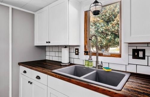 You get the best of both worlds at Creeks Edge Cabin. Enjoy the details of a classic 1950s cottage with many modern updates to make your stay comfortable. The beautiful pine tongue and groove interior, large porches, sun room and wooden dock leading to the large creek will instantly put you at ease. The spacious interior and modern updates throughout will make your stay easy for the whole group. Downstairs you will find two nice sized queen bedrooms, and one of them has private access to the porch and gorgeous views of the creek. Upstairs is delight for kids and adults alike with two beds in a cozy loft. The bathroom is large and guests enjoy access to a washer and dryer. The kitchen has been updated and flows seamlessly into the living space for easy conversations as meals are being prepared. Enjoy cable TV and wifi.