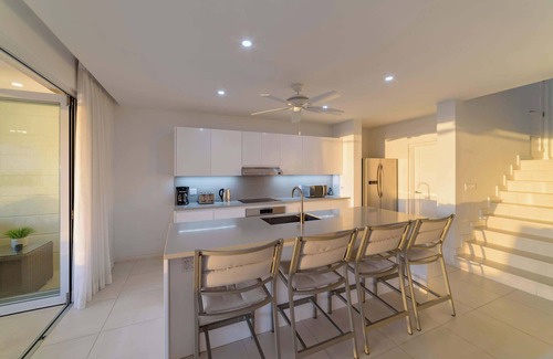 Downstairs you will find the fully equipped open-plan kitchen & cozy seating area, the large floor-to-ceiling glass bi-fold doors open out to an additional covered sitting and alfresco dining area with the large private infinity pool with sun loungers.