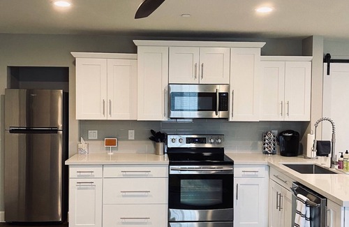 Attached Luxury Guest suite in Mesa Az. Private entrance and private living quarters with a full kitchen that is stocked with all the needed dish-ware and cookware. Private bathroom and bedroom with a King size bed. Located at the end of a cul-de-sac. In a quiet neighborhood 11 miles from sky harbor airport and Phoenix Zoo. Only 6 miles from Scottsdale nightlife. 2 miles from A’s Stadium, 6 miles from Cub's stadium and 8 miles from Giants stadium for spring training. 2 Vehicle parking spaces. This space was newly remodeled with brand new everything!! Sleeps 5 (1 king, 1 queen sofa and 1 folding rollaway bed). 2 big screen TVs with YouTube TV (ESPN and local channels), Netflix, Amazon prime And Disney+. Your own WiFi and a fully stocked kitchen with everything you need to make meals and feel like your home away from home!