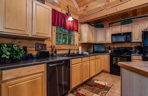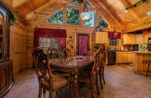 This vacation cabin rental is situated on a quiet street with only 2 other log cabins in this wooded quiet location. Whispering Pines features two large King master suites with en-suite bathrooms which include jetted tubs and separate showers. The bedroom furniture is all high-end and elegant. The king-sized mattresses include pillow tops that contour your body as you settle in for a good night's rest. Entering this Branson Vacation Log Cabin Rental you will be greeted by a great room featuring a wall of windows that give you a glimpse into the world of cabin living in the woods at its very best with the natural light flooding the room. The furniture is all top of the line, designed to create an environment where you feel welcome and comfortable. So relax, throw a log on the fire, watch a movie and melt into the sofa that awaits you or take a dip in the sparkling hot tub on the back deck that faces the endless wooded terrain. The great room has vaulted ceilings, an incredible seasonal wood-burning fireplace, and plenty of room. The kitchen has a wonderful dining table, island, and all the cooking items you will need. Whether dining out or at home, the lodge is close to the award-winning restaurants of Big Cedar, or you may choose to cook in the fully equipped kitchen or BBQ on the back deck. Either way, the cabin features a comfortable dining table inside or spectacular views from the table on the back deck. Or take a soak in the wonderful sparkling Hot Tub on the private deck. This cabin has a wonderful front porch too. Whispering Pines is not just an ordinary vacation rental, this one will have you wanting to come back again and again! It is perfect for couples or a small family. 2 Master Bedrooms, Sleep up to 6 with use of pull-out sofa or air mattress can sleep 6. Pack N Play and a High Chair are available for an additional fee.
