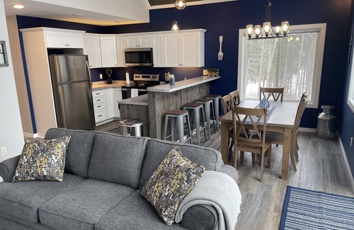 Take in the beauty of a sunsets over the tree line through the large chalet windows which adorn the entire western facing side of the home. Take in a full starry night through the double French doors of the large master suite, located on the 3rd floor. This home comfortably sleeps 8 guests with an additional queen guest room and large family room on the ground floor, as well as a double bunk room on the main floor. You will find plenty of room for entertaining in this modern home, with a dining room and breakfast counter seating in the main living area. Two flat screen TVs for the kids, as well as high speed internet and streaming services are also accessible. Linens including bedding and towels are furnished as well as a washer/dryer, dishwasher, Keurig and toaster.