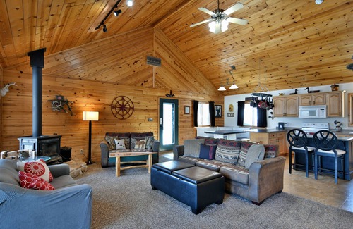 Enjoy the stunning lake view from the screened in back porch that extends across the entire length of the home! This chalet style 4 bedroom 2 bathroom log sided home is nestled down a private dead end road. Featuring a large open concept kitchen with all the amenities, large bedrooms, a spacious great room, and game room. The great room offers an extra large flat screen TV, ample seating, and cozy stove fireplace. The basement game room features fun for all! Game table, foosball, flat screen TV and electric fireplace. Laundry onsite and extra refrigerator for ample food storage. The home also has high speed internet/WIFI.