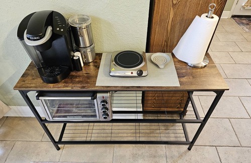 Suite is an open room with a comfy queen size pillow top bed, a comfy sofa that folds out into a full size bed with a memory foam mattress topper, black out curtains, dresser with 5 drawers, refrigerator/freezer, bar with microwave, toaster oven, double burner electric hotplate, pots, pans, croc pot/slow cooker, cookware spoon and spatula, can opener, ice trays for freezer, plates, cups, bowls, knives, spoons, forks, broom & dust pan, swiffer wet jet, towels, linens, a few rolls of toilet paper & soap bars provided. TV That you can swivel to face either bed or sofa. Wifi and Roku TV, where you watch the ROKU channels or sign into your favorite streaming apps. Bathroom includes toilet, sink & shower with hand-held shower head. Washer & dryer right outside of your side door that is just for you. Please let me know if you have any questions.