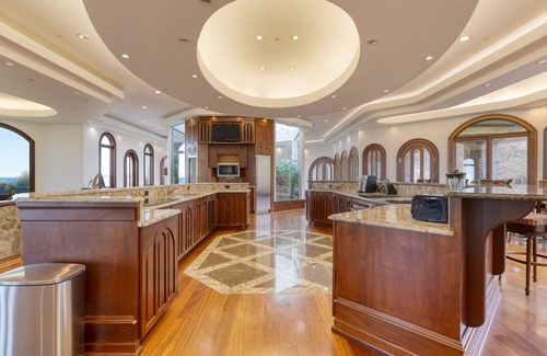 Expansive picture windows within the main house frame panoramic bay views, providing an uninterrupted connection to the natural beauty surrounding the home. Dual ovens and abundant counter space adorn the fully-equipped chef's kitchen, inviting culinary delights. You'll find two large dining tables on either side of the kitchen, giving your group plenty of space for meals or game nights with the water as your backdrop.