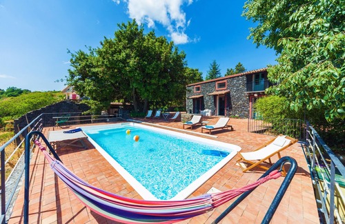 The breathtaking view of the Ionian coast, the Gulf of Taormina and the Italian peninsula make the landscape from the villa absolutely unique. Just try to imagine it! The villa is built entirely of lava stone. It is spread over 2 floors, both bright, spacious and welcoming. On the first floor there is a large living room, a kitchen, a bathroom/laundry room, a pantry, a wonderful library and a room with two single beds, one of which is a queen-size bed. On the second floor there are two double suites with private bathrooms. The interior is tastefully furnished, as can be seen from the photos. The outside of the villa is an enchanting dip in the deep blue horizon. There are various charming corners, including: the pool area between the imposing lava stone façade the Gulf of Taormina and the Mediterranean Sea; the barbecue area with the typical stone oven (ideal for pizza); many relaxing corners... All this completely immersed in a typical Etna park (oaks, chestnut trees, melicuccoe - Minicucco in Sicilian - ...)