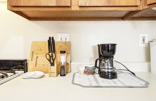 Recently upgraded and furnished throughout, this spacious and private ground-level studio apartment features an open floor plan with a kitchen, dining area, full bathroom, and living space with a 40” Smart TV.