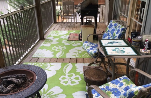 outside ceiling fans and high speed outdoor fan gas grill comfortable seating Gas fire pit big screened porch perched high in the trees overlooking butterfly bushes and craddock creek arm of the lake