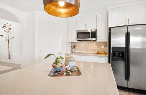 The well-equipped kitchen features an induction stove top, double oven, double sink with a garbage disposal, pot filler, and an island for effortless entertaining. Cook with confidence as you create your favorite meals for yourself and your guests.