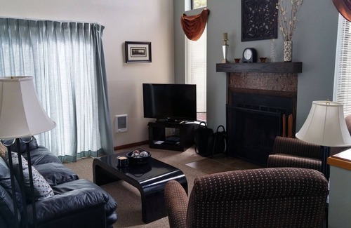 Spacious 2 bedroom 2 bath condo with wood burning fireplace. Fully stocked kitchen with full size refrigerator, range, microwave. Dining room with table that seats six, private deck with barbecue, private garage with remote, upstairs with full bathroom and twin beds, free high speed internet, flat screen tv's in bedrooms and living room (dvd player), beautiful landscaping with tall pines and stream and ponds.