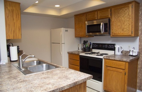 Spacious 2 bedroom 2 bath condo with wood burning fireplace. Fully stocked kitchen with full size refrigerator, range, microwave. Dining room with table that seats six, private deck with barbecue, private garage with remote, upstairs with full bathroom and twin beds, free high speed internet, flat screen tv's in bedrooms and living room (dvd player), beautiful landscaping with tall pines and stream and ponds.