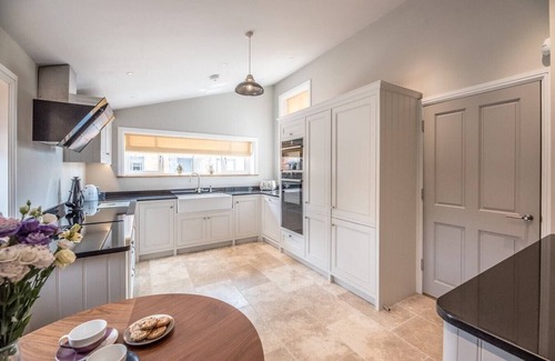This light and airy kitchen is ideal for catering at home with built-in units housing a double electric eye level oven, a four-ring hob, a large upright fridge with freezer beneath, a dishwasher, a microwave, a washer/dryer, a toaster, and a kettle. There's also a little table and chairs for morning coffee!