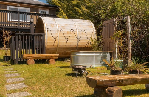 Standard hotel layout in a cozy cottage setting featuring a queen bed. Little Beach Resort, a coastal wellness retreat nestled on the edge of Vancouver Island, offers a rustic West Coast cottage experience. Little Beach Resort is a family-owned accommodation that provides travelers with memorable vacation experiences. Most rooms have ocean views and feature a variety of floor plans. We offer room styles such as Queen Standard Room, Queen Room Kitchenette, Queen Rooms with Jetted Tub, One Bedroom Kitchen Suite, and a Two Bedroom Cottage. All rooms have a fridge/freezer, toaster, coffee maker, kettle, microwave, fiber optic TV, and decks. Enjoy complimentary in-room coffee and tea, Fibre Optic Wi-Fi, paved parking, cedar barrel sauna, cold plunge/shower, and picnic tables. After a day of adventure, relax and enjoy the rejuvenating wellness amenities. Guests can also book a private experience or a full West Coast Wellness Aufguss Experience, featuring a custom wellness journey, including a sauna with scented water/ice, breathwork, outdoor small & large cold plunge/shower, no hot tub, and, for the hearty, an ocean swim at Little Beach. Our location across from Little Beach is a great place for paddleboarding, kayaking, snorkeling, swimming, or just relaxing. Little Beach Resort is a short walk to town, art galleries, restaurants & shopping. The famous Wild Pacific Trail is at your doorstep, and we are just 8 km from the Pacific Rim National Park Reserve and the start of Long Beach. At Little Beach Resort, we've carefully designed our amenities to enhance your coastal wellness experience and provide comfort, convenience, and connection to Vancouver Island's natural beauty. From practical essentials to unique wellness offerings, these amenities transform your stay into a rejuvenating retreat while supporting your daily adventures. We do not allow pets. Those with allergies can rest comfortably knowing that our Little Beach Cottages are 100% no-pet, no-smoking.
