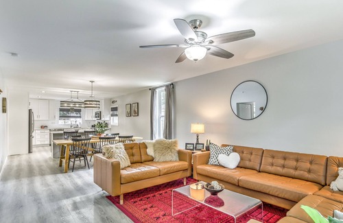 For meals or entertaining guests, gather around the beautiful farmhouse-style dining table which seats six comfortably. Cooking becomes a joy in this totally updated and fully-equipped kitchen featuring stainless steel appliances, crisp white cabinets, and subway tile backsplash for your family chef. An island offers additional seating for two plus plenty of counter space for food prep or serving dishes. Coordinating modern light features in both the kitchen and dining area bring the two spaces together with great style.