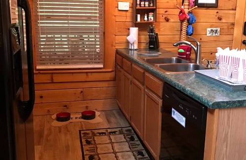 A hot tub sits on the deck. A gas grill is also located on the deck along with a high top table and chairs, rocking Chairs and a slider sofa. The cabin is equipped with WiFi internet. The owners have movies and games are available for guest to use. All bedding, towels and kitchen utensils and appliances are provided.