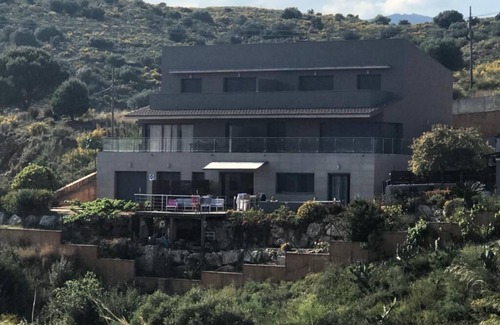 Ground floor: Separate entrance, serving a small bedroom, north side, under stairs, a shower room, with a small window to the West, WC, glass sink, shower, white earthenware walls placed at the point, terra cota tiled floor. A large living room with 2 bay windows opening onto a large tiled terrace, with sea and mountain views, opening onto a large, fully equipped kitchen, marble worktop.