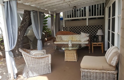We offer a separate, private bedroom and bath, with it's own kitchenette, washer/dryer, front and side sitting areas. The unit has it's own parking in front, with it's own private entry. Rental includes window a/c, fan, 40" tv with cable, internet, keyless entry and a closet full of sundries and beach gear. There is a backyard sunning area and b-b-q.