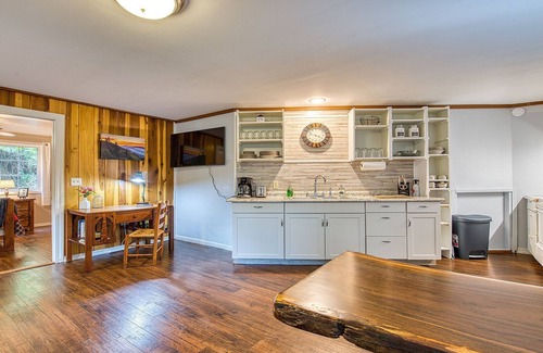 Relax in our three living room areas. Enjoy preparing a wonderful meal in our well-equipped kitchens (that's right, there are two kitchens) or on the charcoal grill or take full advantage of the many dining options in Bryson City and surrounding towns. Take in the outdoor sights and sounds from our front porch dining table, covered patio, or backyard firepit. The majority of the indoor decor and furniture were crafted by talented local artisans. The three full bathrooms are en suites in three of the five bedrooms- one on the first level, one of the second level, one on the third level of the house. The half bath is located off the main living room and kitchen. If part of your group needs a little space all to themselves they can enjoy the apartment suite with a living room, full kitchen, dining room, and bedroom with an en suite bathroom.