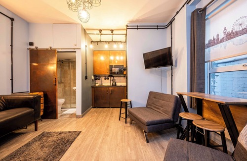 This steampunk warehouse conversion has been designed with hosting Couples and families with children who adore Harry Potter. In this stylish and well designed Studio apartment there is a cosy double bed off the living room with a kids size bunk bed above. There is a Harry Potter Themed sleeping pod under the stairs with a large selection of Harry Potter Games and decorations.