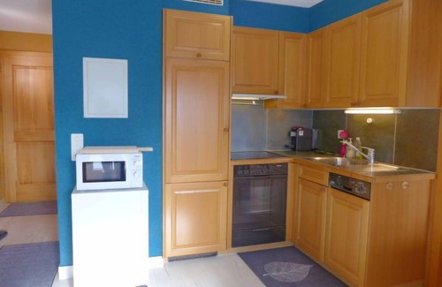 "Résidence Byblos 11", 2-room apartment 46 m2 on 1st floor. Fully renovated in 2022, comfortable and tasteful furnishings: living/dining room with cable TV. Exit to the balcony. 1 room with 1 double bed (2 x 80 cm, length 200 cm). Exit to the balcony. Open kitchen (oven, dishwasher, 4 ceramic glass hob hotplates, toaster, kettle, microwave, freezer, electric coffee machine, Capsules for coffee machine (Delizio) extra, raclette grill, fondue Set (chinoise, cheese)). Bath/WC. Large terrace 24 m2, south facing position. Balcony furniture, deck chairs (2). Beautiful view of the mountains and the forest. Facilities: iron, hair dryer. Internet (WiFi, free). Parking space n 11. Please note: non-smokers only. 1 small pet/ dog allowed.