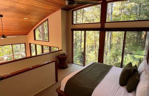 Upstairs to the bedroom, with a king-sized bed, floor-to-ceiling windows overlooking the rainforest. Your rainforest vista continues in the ensuite bathroom with a walk-in shower and a large sunken spa bath for luxuriating in bubbles surrounded by rainforest on three sides.