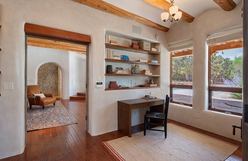 The stunning living room is centered around the large kiva fireplace, and features tall windows and glass French doors that pour abundant natural light onto the gorgeous diamond plaster walls and classic, comfortable furniture. The gorgeous fanned Vigas lead your eye straight to the stunning views of the New Mexico landscape, which you can also take in from the patio just outside.